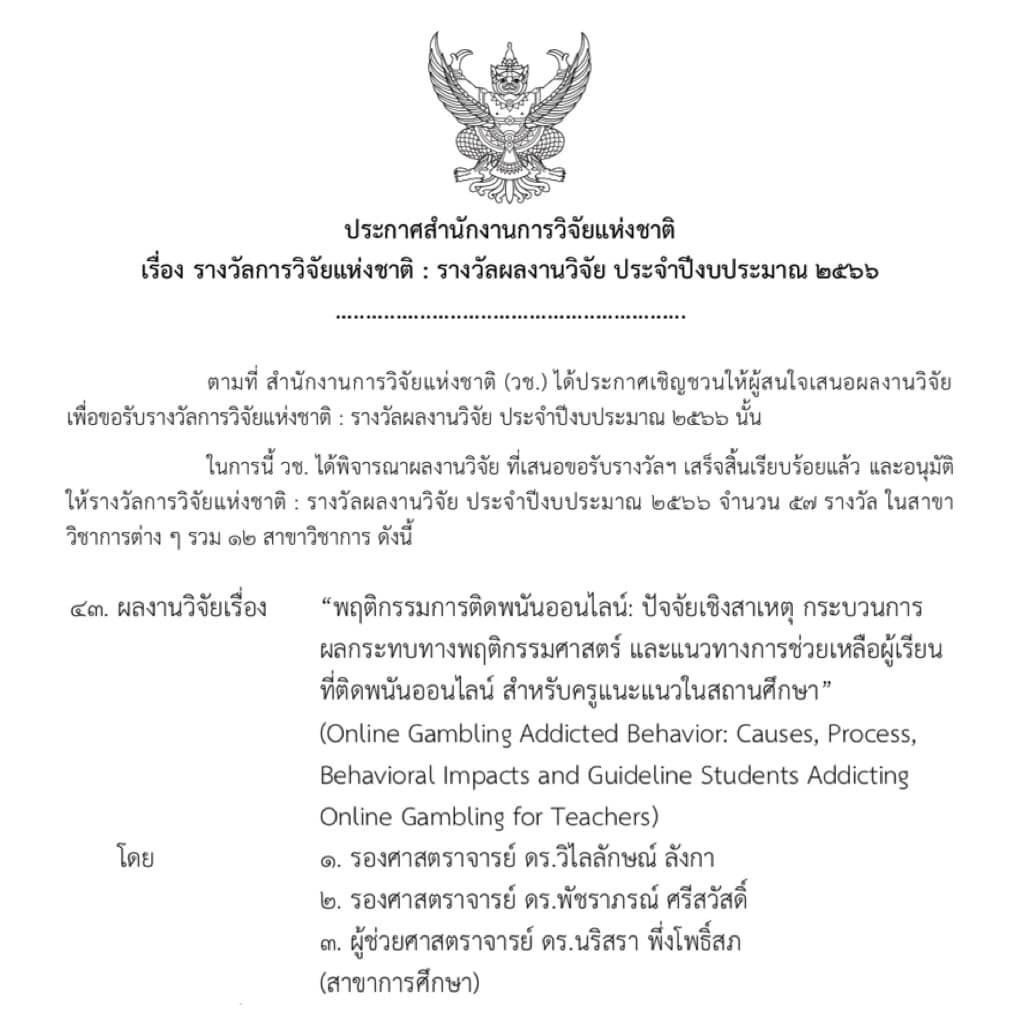 ได้รับรางวัลผลงานวิจัย ประจำปีงบประมาณ 2566 จากสำนักงานการวิจัยแห่งชาติ (วช.)