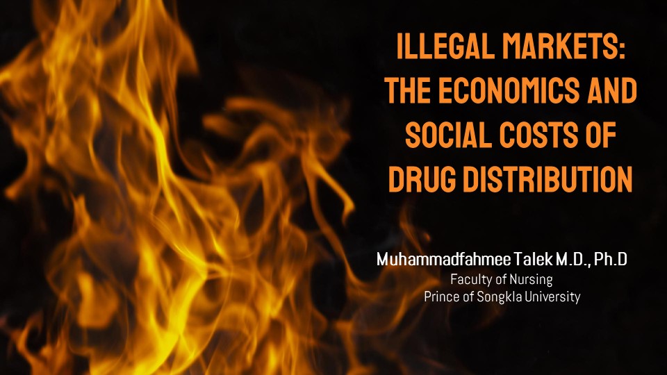 2. ตลาดผิดกฎหมาย : เศรษฐศาสตร์และราคาทางสังคมของการกระจายสารเสพติด โดย ดร.นพ.มูฮัมมัดฟาห์มี ตาเละ คณะพยาบาลศาสตร์ มหาวิทยาลัยสงขลานครินทร์ วิทยาเขตปัตตานี นักวิชาการศูนย์วิจัยปัญหาสุรา