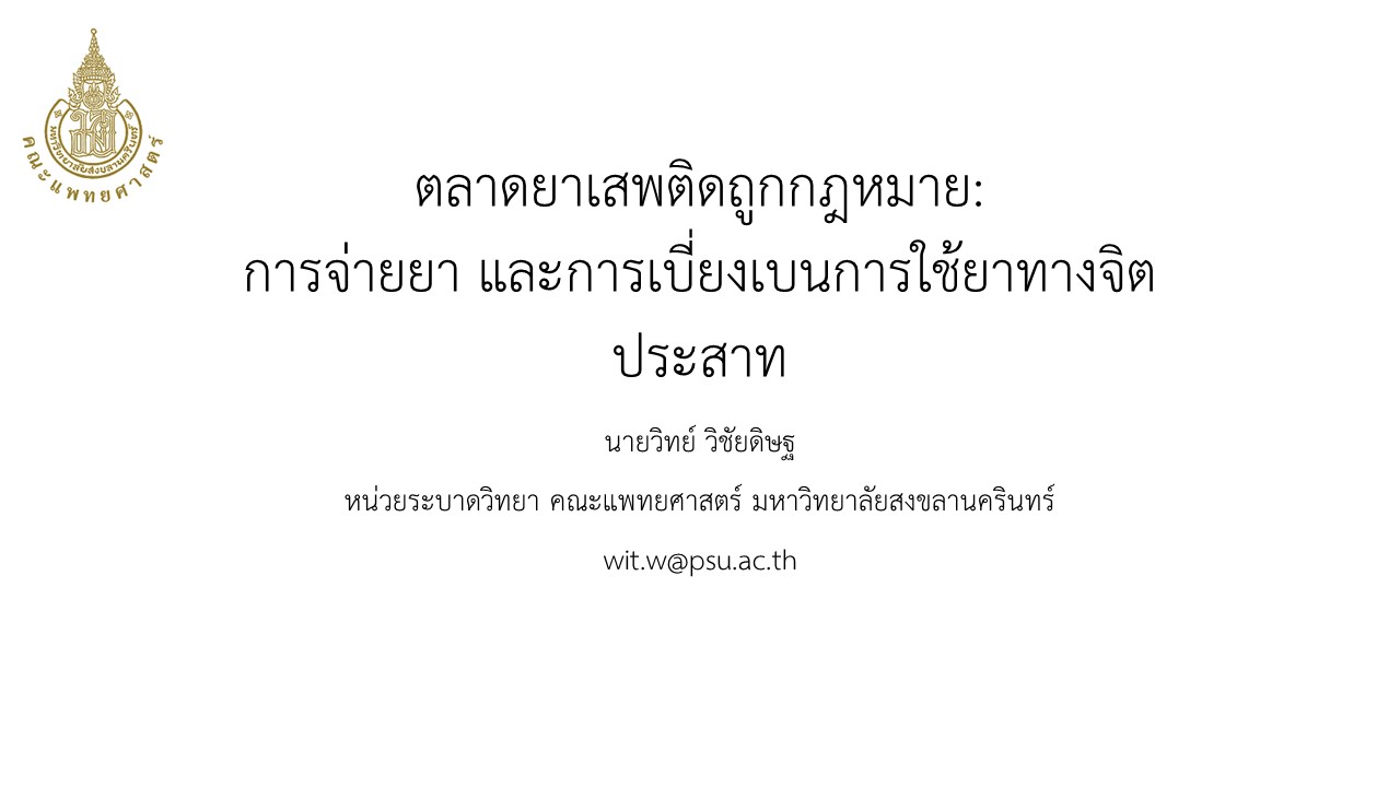 3. ตลาดยาเสพติดถูกกฎหมาย : การจ่ายยา และการเบี่ยงเบนการใช้ยาทางจิตประสาท โดย อ.ดร.วิทย์ วิชัยดิษฐ สาขาวิชาระบาดวิทยา คณะแพทยศาสตร์ มหาวิทยาลัยสงขลานครินทร์ นักวิชาการศูนย์วิจัยปัญหาสุรา
