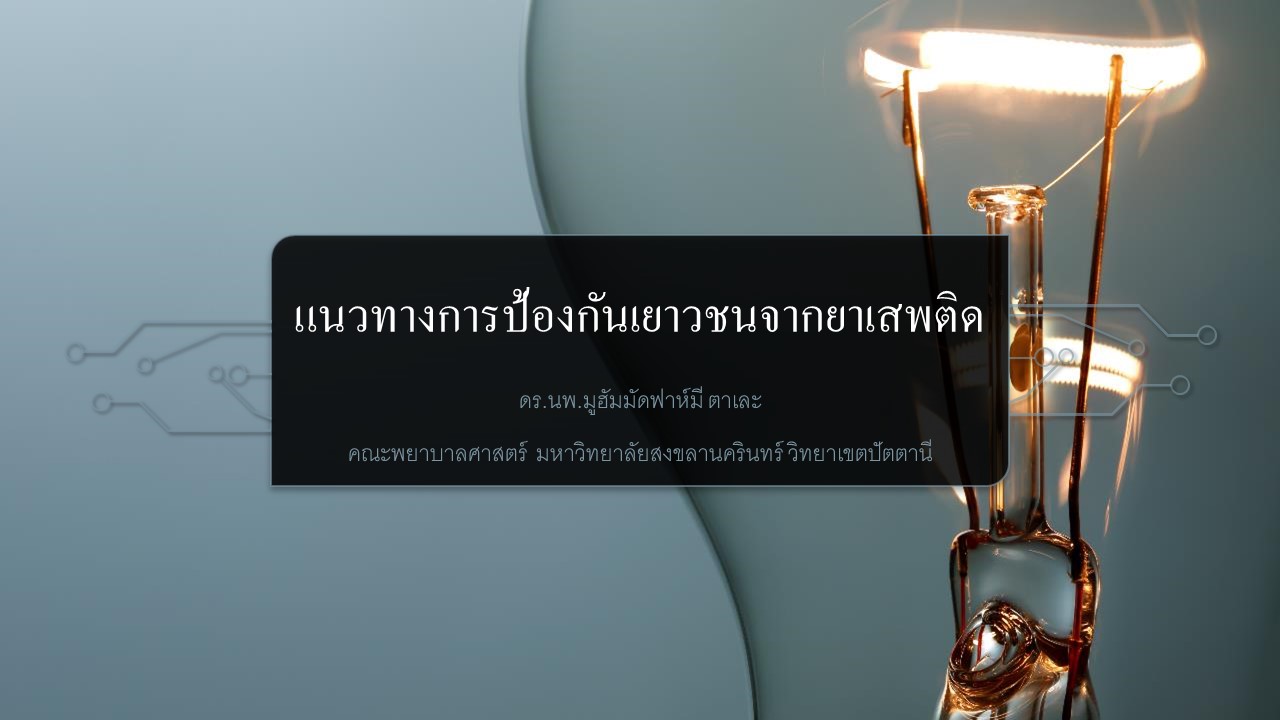 6. แนวทางการป้องกันเยาวชนจากสารเสพติด โดย ดร.นพ.มูฮัมมัดฟาห์มี ตาเละ คณะพยาบาลศาสตร์ มหาวิทยาลัยสงขลานครินทร์ วิทยาเขตปัตตานี นักวิชาการศูนย์วิจัยปัญหาสุรา