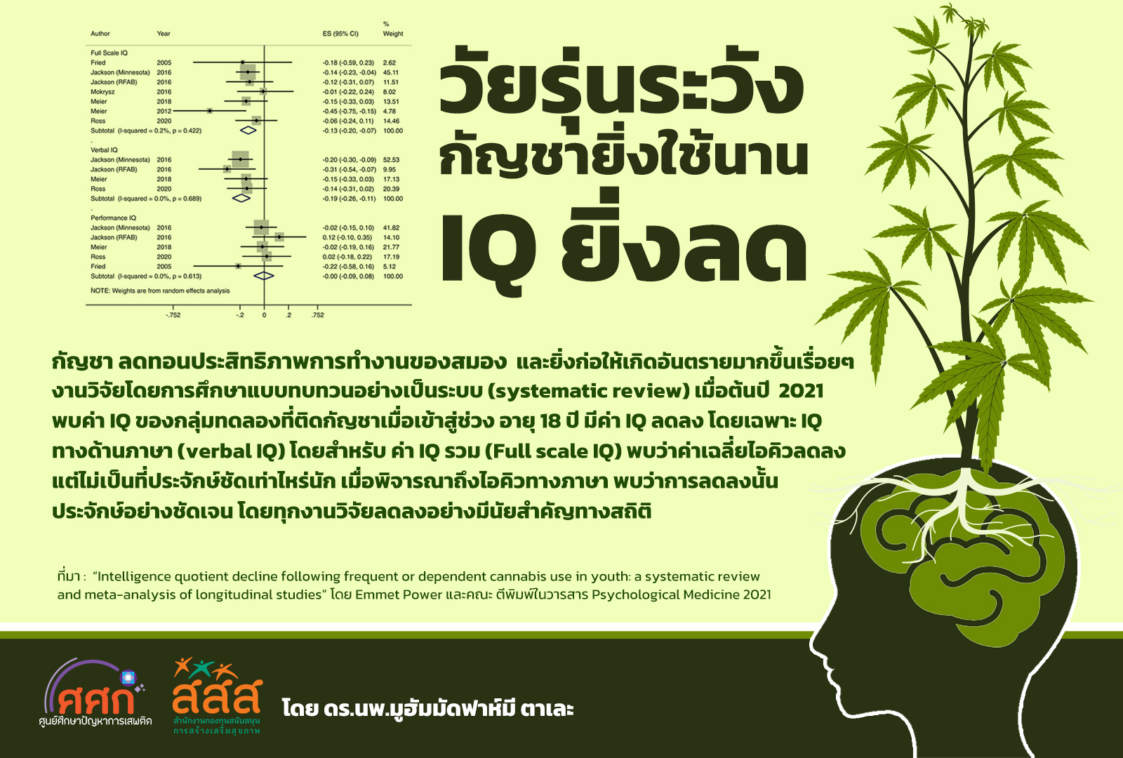 การศึกษาฉบับนี้ได้รับการตีพิมพ์ในหัวข้อ “Intelligence quotient decline following frequent or dependent cannabis use in youth: a systematic review and meta-analysis of longitudinal studies” โดย Emmet Power และคณะ ตีพิมพ์ในวารสาร Psychological Medicine เมื่อช่วงเดือน มกราคม 2021 ที่ผ่านมา